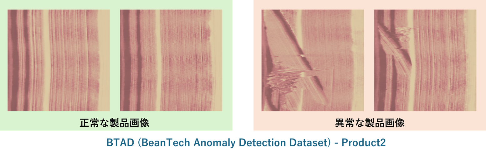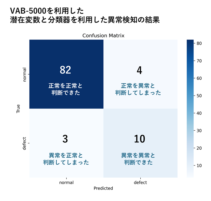 VAB-5000環境で採用したのは、オートエンコーダの入出力の再構成誤差を利用せず、潜在変数に対して分類器を適用するアプローチです。本アプローチは高速に動作することができる反面、分類器の学習は教師あり学習となるため、正常データだけでなく、相当量の異常データも必要になるという課題があります。本記事の例でも、BTADデータセットは、正常データに比べて異常データの数が少ないため、分類器の異常値に対する学習が十分にできず、再構成誤差を活用するアプローチと比べると、異常を検知する精度であるRecallが低くなる結果となってしまいました。精度の問題を解消するには、十分な量の正常データと異常データを用意した上で、エンコーダと分類器が異常データに対して高い感度を示すように調整を行う必要があります。一方で、本アプローチは高速に異常判定を行うことができるため、生産ラインにおける一次スクリーニングや、異常候補を高速に抽出して後段の検査工程へ引き渡す用途に適していると考えられます。