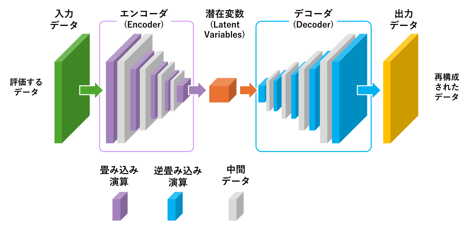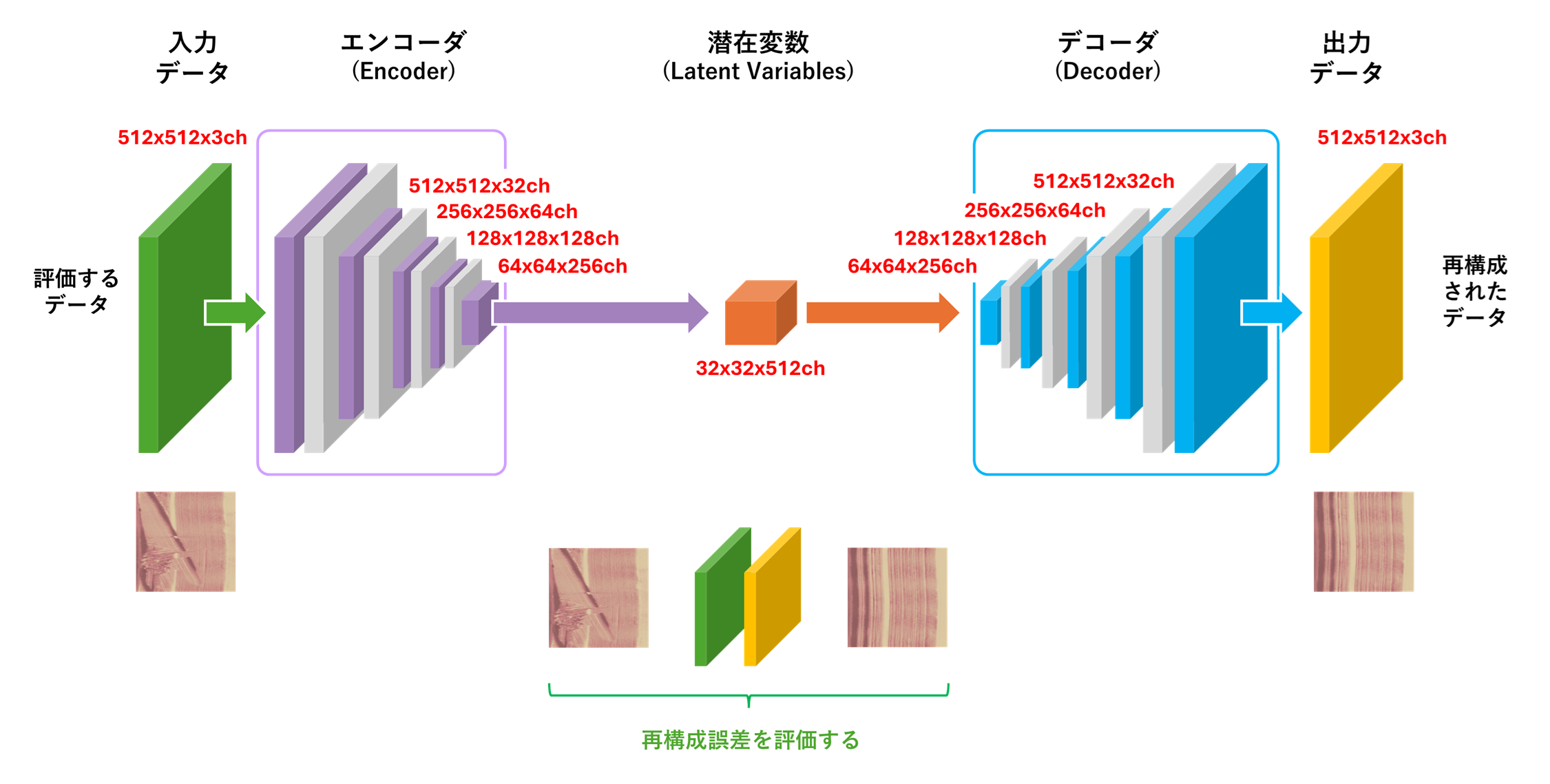 デコーダ(Decoder)は、オートエンコーダの後半部分で、エンコーダによって生成された潜在変数を、元の入力データに近い出力データへと再構築する役割を果たします。エンコーダの出力である潜在変数を入力として、ニューラルネットワークの層を通じて次元を徐々に増やし、元のデータ形式に戻します。本記事で紹介するアプリケーションのデコーダは、エンコーダが圧縮した32×32次元の潜在変数に対して、逆畳み込み演算を加え、512×512ピクセルの画像を再生成します。この動作により、オートエンコーダのモデル全体が入力データを自己符号化できるようになり、学習を通じてデコーダは潜在変数とエンコーダの処理により失われた情報を復元する能力を獲得します。通常、エンコーダとデコーダは対称的な構造を持ち、オートエンコーダ全体として入力データと出力データの一致を目指します。