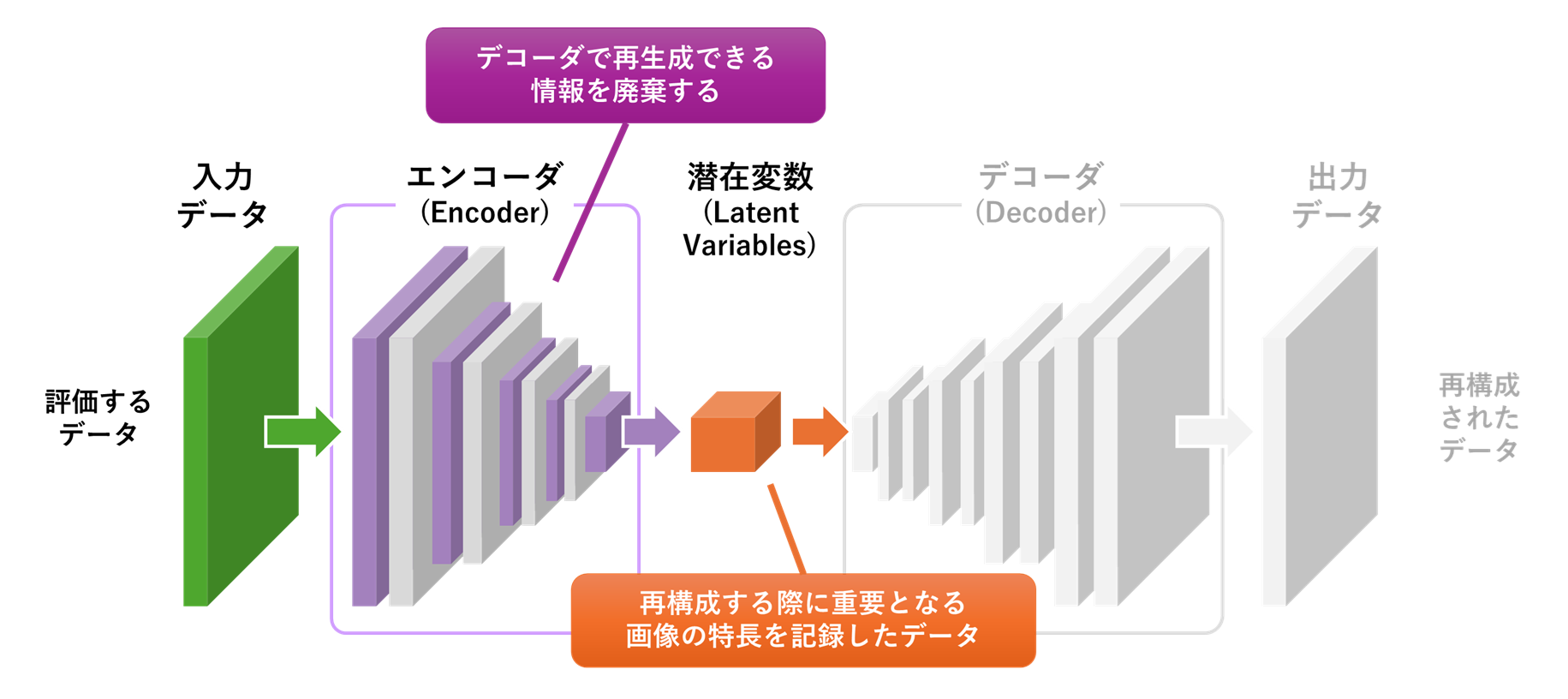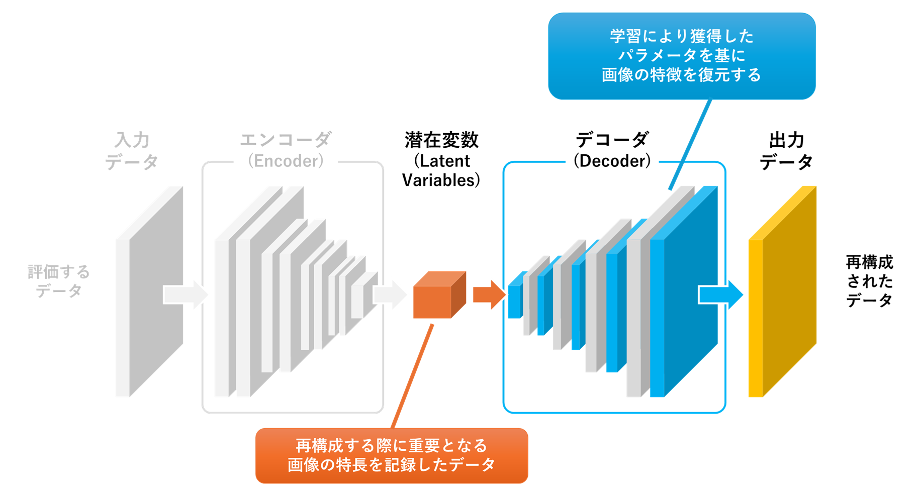 潜在変数は、エンコーダによって入力データから抽出された低次元のベクトル表現で、オートエンコーダのボトルネック部分に相当します。これらはデータの隠れた構造や本質的な特徴を表すもので、高次元な入力データを低次元に圧縮した形で保持しています。低次元であっても潜在空間の質が高ければ、類似データのクラスタリングや、正常データに対する再構成誤差の低減が可能になり、入力データをより精密に分析できるようになります。