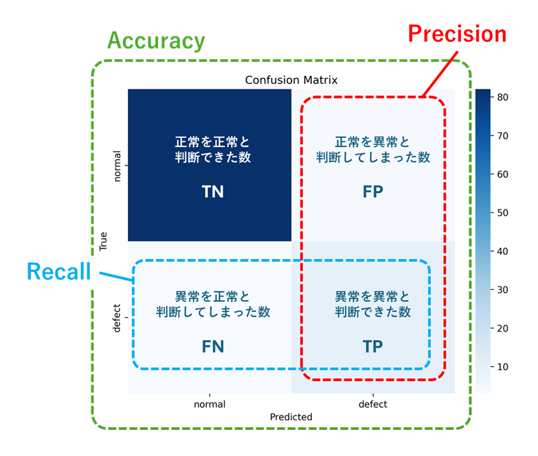 計算式: (正しく予測した正常(TN) + 正しく予測した異常(TP)) / 全データ数(TN+TP+FP+FN)