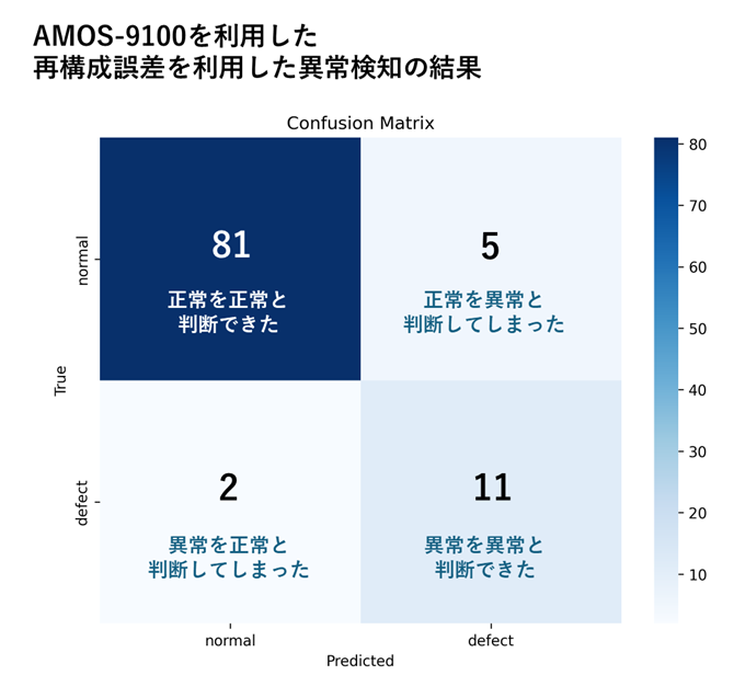 今回構築したアプリケーションを、BTAD Product2のうち、学習に利用しなかったテスト用データを用いて異常検知の精度を評価したところ、以下のような結果となりました。再構成誤差に着目するアプローチにより、高いRecallを実現できていることがわかります。