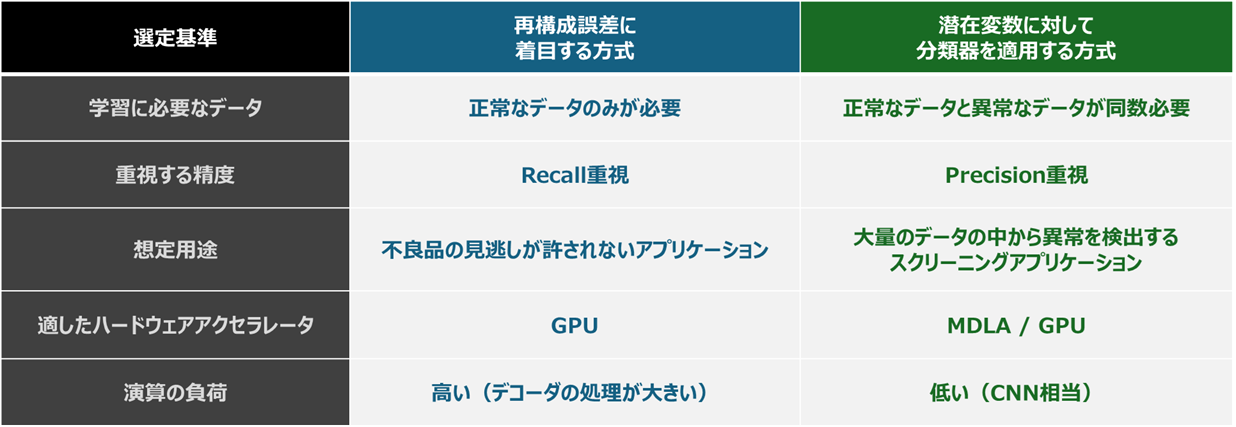 本記事では、オートエンコーダにより異常を検知する方法のうち、二つのアプローチ、再構成誤差を活用した異常検知の方法と、潜在変数に対して分類器を適用する異常検知の方法を紹介しました。これらは、どちらの方式が優れているというものではなく、利用するシーンや精度、採用するハードウェアリソースに応じて、適切な方式を選ぶべきものです。以下に選定する際の基準をまとめます。
