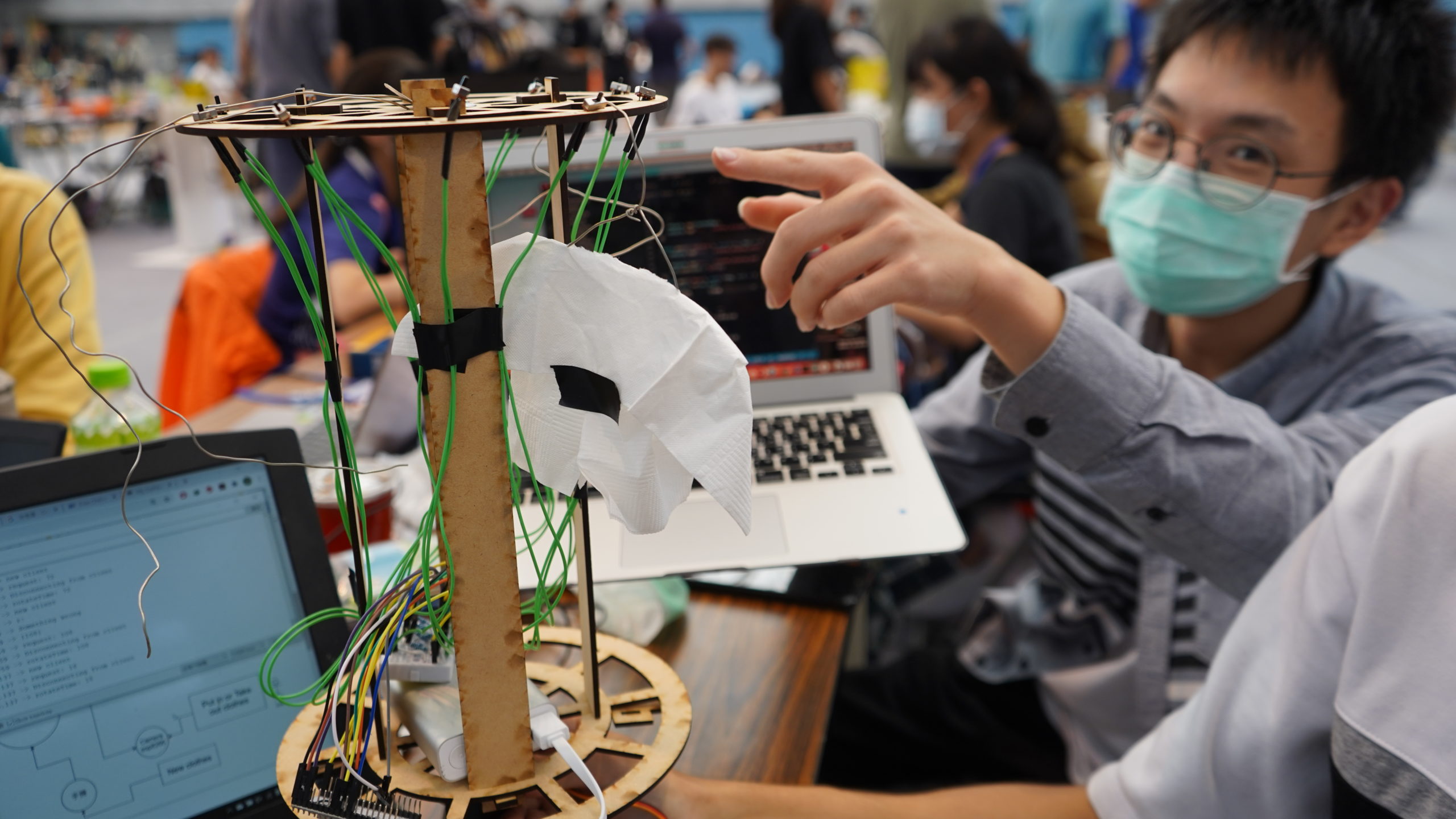 “閉嘴,戴上口罩”。在所有作品中最讓人印象深刻的,莫過於這組簡潔有力傳達作品理念的同學,他們想做的,是用人工智慧懲罰不戴口罩的人。透過AI與機械的結合,只要讓威盛Pixetto偵測到鏡頭前的人沒戴口罩,機器就會自動發射”口罩大砲。雖然此作品以娛樂性質為主,精準度還有改善的空間,但他們絕佳的創意仍為他們拿下了威盛特別獎。